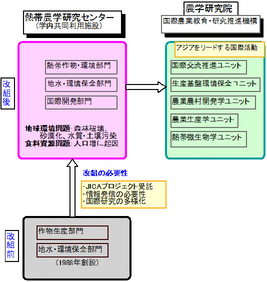 Meanwhile, the institute's international education capacity is failing to satisfy the growing demand for acceptance of students and trainees from developing countries. The institute must increase the number of teachers and sections to continue operations as a major tropical research center to tackle global environmental and food problems. Therefore, the institute must reorganize itself to create an international development section for international development research. At the same time, the institute must build networks with relevant organizations to enhance its information functions and vitalize its future operations.