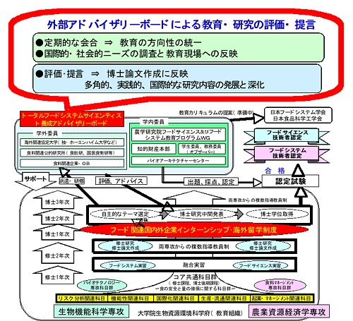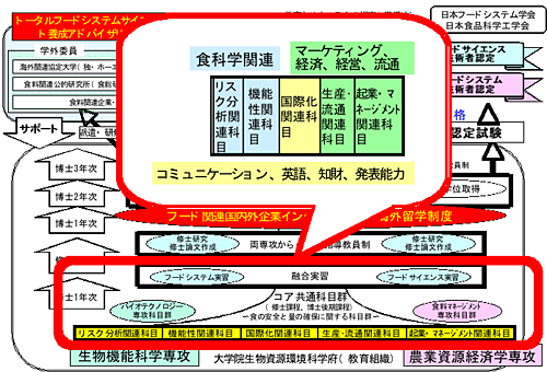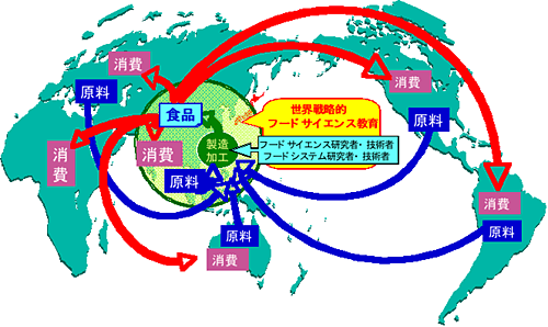 食の安全性や機能性と量の確保のためには食品原材料の生産現場である農場から食卓までのフードチェイン全ての課程、すなわち原料となる農水畜産物の生産・開発、これらを原料とした食品の製造における基礎研究、市場調査、企画開発、製造現場における衛生管理、加工技術開発、さらに流通段階での衛生管理や流通管理といった分野で、国際性、戦略性、市場性、安全性、機能性とマネージメントに対する知識と意識が必要であり、この教育には自然科学と社会科学の融合教育が重要となってきます。以上の視点から、国内・海外食品関連企業で世界戦略的視点で食品研究・開発できる研究者・技術者ならびに国際的基準に立脚した食料政策立案や対外交渉能力を持つ研究者・技術者を育成するための大学院教育プログラムとして「世界戦略的フ−ドサイエンス教育」を提案いたします。