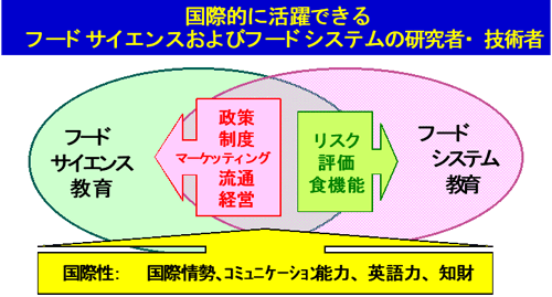 国際的に活躍できるフードサイエンスおよびフードシステムの研究者・技術者の育成のためには、社会ニーズの調査結果などから、フードサイエンス教育においては、食に関する政策、制度、マーケッティング、流通、経営などのフードシステム分野の教育が、また、フードシステム教育ではリスク評価、食の機能性に関するフードサイエンス分野の教育がそれぞれ必要で、さらに両分野において、国際性とコミュニケーション能力と知的財産権についての教育も重要となります。