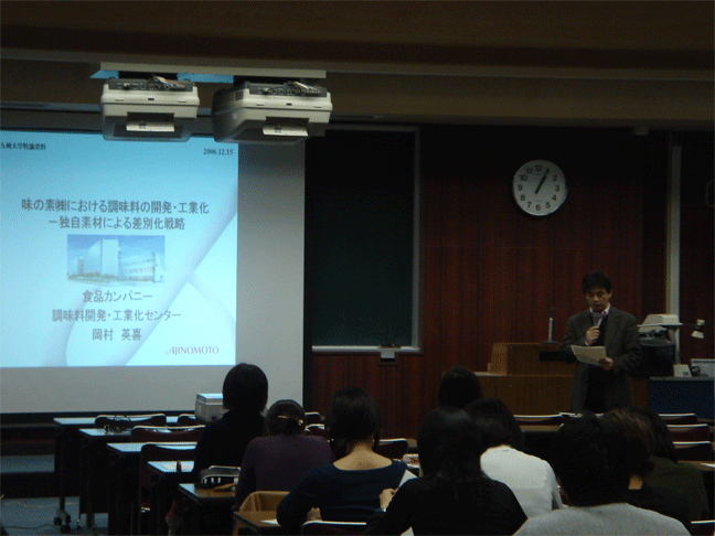 現在では日本語の「うま味」は第五の味覚として、「UMAMI」という国際語になるに至った。また、甘味、塩味、酸味、苦味、うま味の基本味では表現しきれない「おいしさ」の一つである「こく」についても、味の素(株)では口にふくんだとき口腔、鼻腔内で感じる味覚・嗅覚が「コク味」であると定義し、その「コク味」の本質の解明、及び創出研究に注力している。本特論では味の素(株)独自のコク味素材の開発を通じた商品の差別化戦略について解説され、受講学生に対して、本教育プログラムにおいて研究開発における実践性と研究の展開力の必要性を理解させるなどの教育効果が高かった。