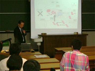 油脂メーカーの研究開発の責任者である演者は、まず油脂の構造、分類および物理化学的性質などを説明し、続いて油脂特に中鎖脂肪酸の代謝、消化吸収機構、さらに栄養機能性について平易に解説した。次に、特定保健用食品としての中鎖脂肪酸含有脂肪(MCT)の食品としての有効性を検証するために実施された数多くの研究データを紹介しながら、企業は安全性確保のために相当の時間とコストをかけていること、また食品メーカーは機能性食品を開発する際、食品と薬品との違いを明確にしたうえで商品を開発する必要性を強調した。最後に、安全と安心に信頼を加えた健全性が21世紀の食品産業にとり決定的な重要性を持っていることを理解させるなど、教育効果があった。