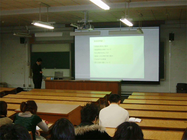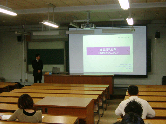 演者は現在、伝統的な天然素材(乳化安定剤、安定剤製剤、ゲル化剤、 増粘剤製剤、増粘多糖類単品)から最先端のナノサイエンスを駆使した新規素材まで幅広い食材を取り扱うとともに、機能性食品素材(緑茶抽出物、ミネラル・ビタミン、卵黄分画品)の開発に取り組んでいることをまず話した。次に、乳化の原理と乳化剤の構造・機能・特性や種類について、ビデオを使ってわかりやすく講義した。さらに、最新の界面制御技術について具体例を挙げて説明した。すなわち、界面制御技術は、食品用の界面活性剤が形成するマイクロエマルション(可溶化製剤)を利用することで、水不溶の機能性素材やスキンケア化粧品への応用が可能であること、界面制御技術によりナノ領域で栄養素の物性をコントロールして、食品の加工プロセスから消化吸収に至るまでに発生する課題を解決する「ニュートリション・デリバリー・システム」の開発が進んでいること、さらに精油類や油溶性ビタミン類を水中に透明溶解するスーパーエマルジョン」技術、不溶性物質などを微細化し、均一で再凝集が起こりにくい安定分散系にする「スーパーディスパージョン」技術が確立されたことを紹介した。最後に、演者が携わった「植物油の硬さを極少量で自在にコントロールできる」乳化製剤開発の秘話を紹介し、研究開発のきっかけはちょっとした偶然と直感力からはじまり、成功は飽くなき好奇心と執念から生まれること、そしてそれが次の商品開発、テクノロジーにつながる可能性があることを受講者に伝え、教育成果があった。