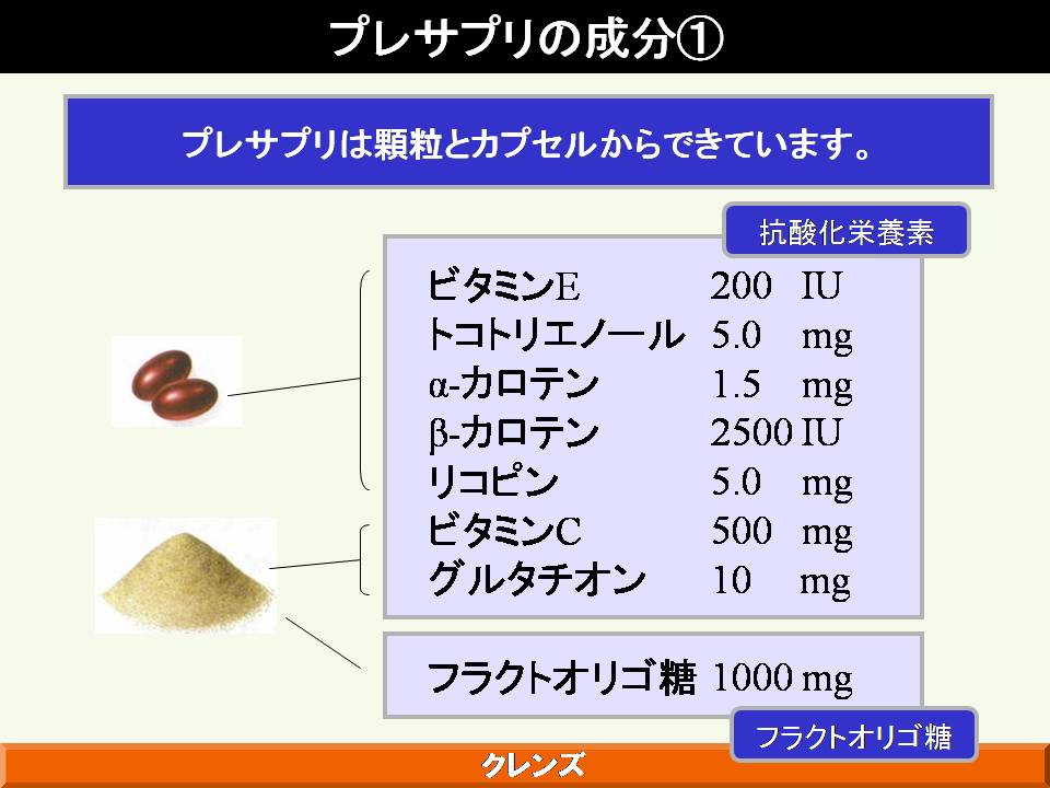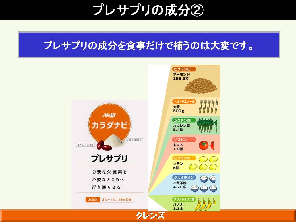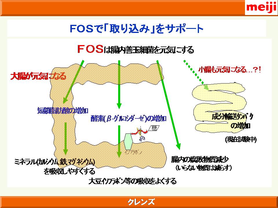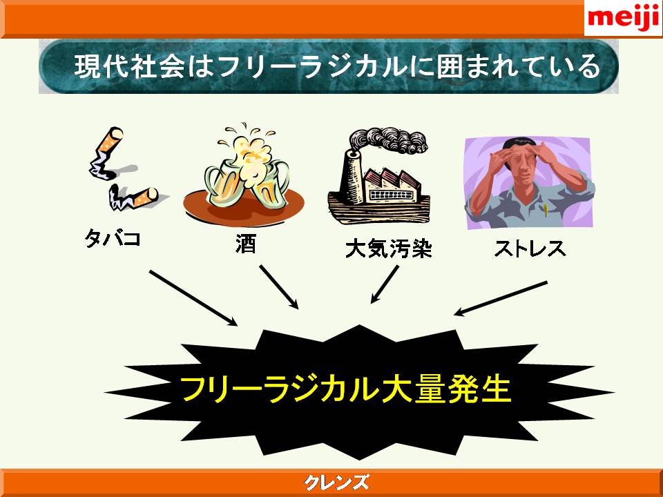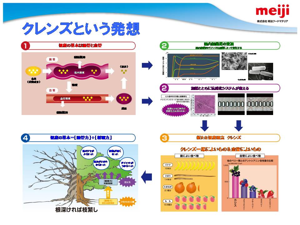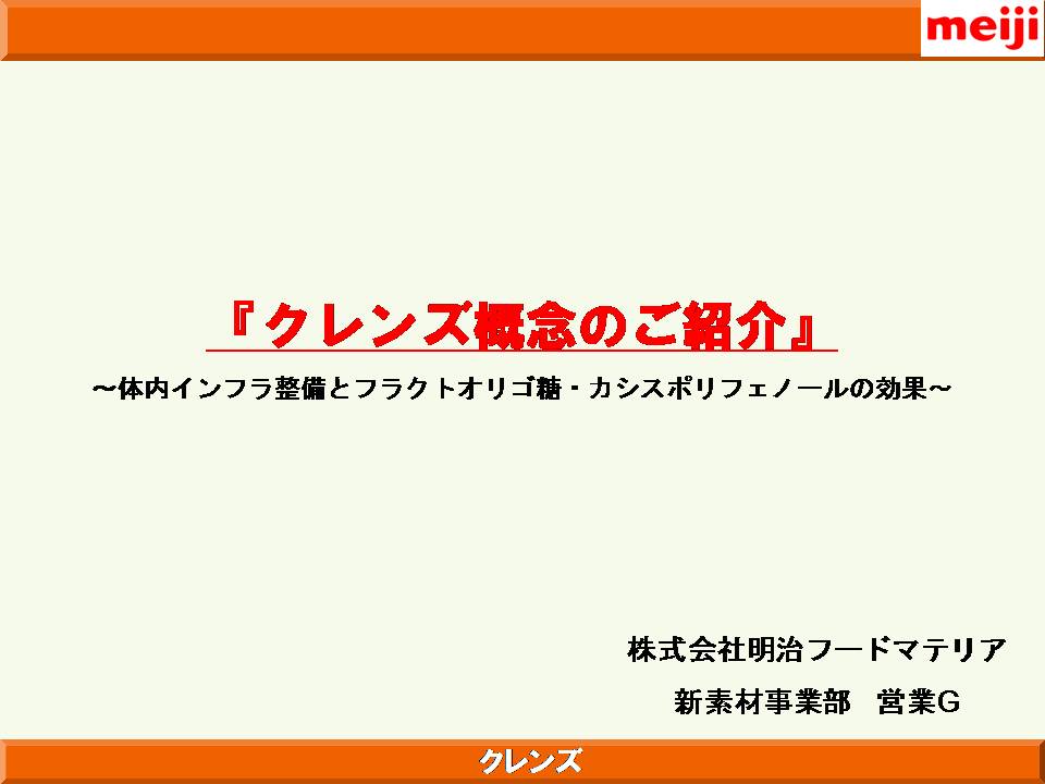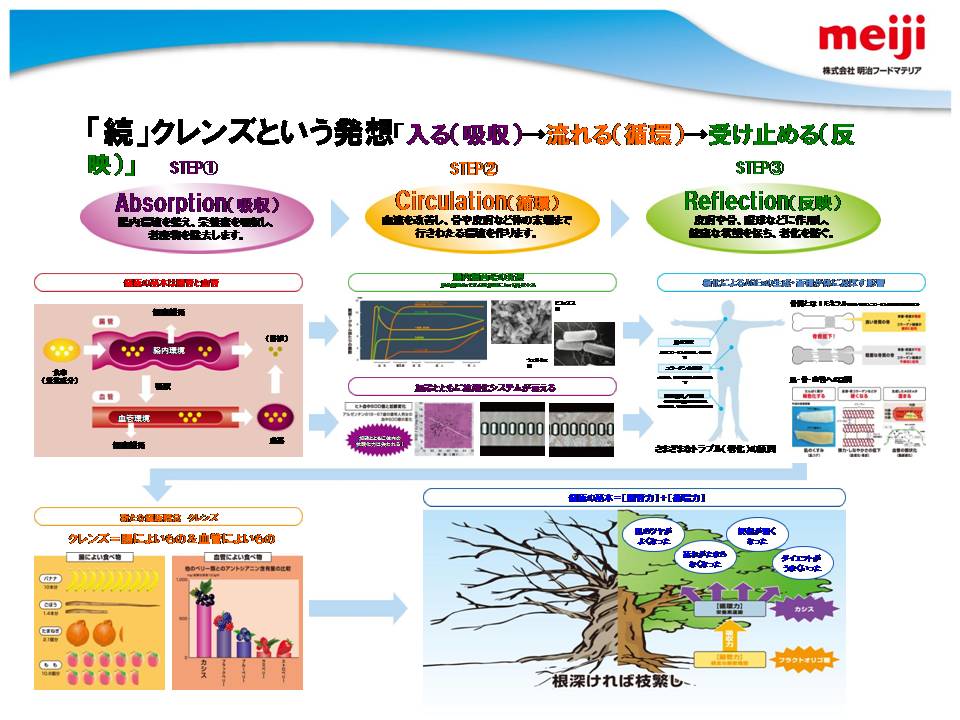 また、明治製菓の健康食品の概念として、体がさびる、こげる ことを防ぐ、ことが大きなテーマとしてあり、これは食べた栄養成分が効率よく吸収されるためにはまず腸がきれいであることが大事であり、吸収された成分の循環を良くするためには血管の状態、血液の状態を健康に保ち、酸化も防止する必要があることが示された。これを達成するための「クレンズ」という概念について解説された。体内インフラの整備を目的に、同社が研究した成果として、フルクトオリゴ糖、体内の糖化反応を抑制する植物成分として見出されたドクダミ、セイヨウサンザシ、カモミール、ブドウの葉の抽出物の有効性について解説された。