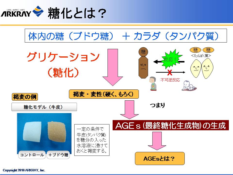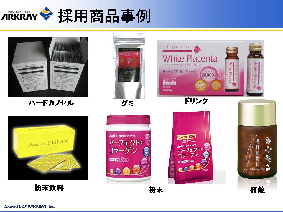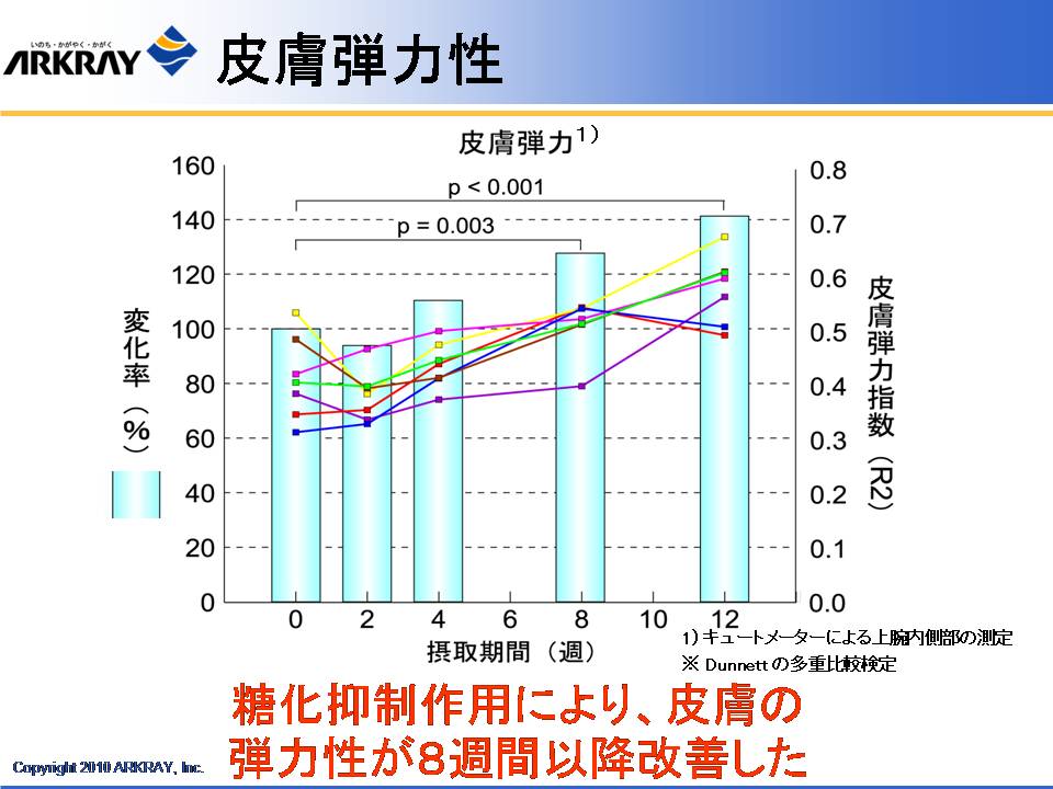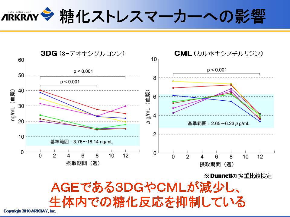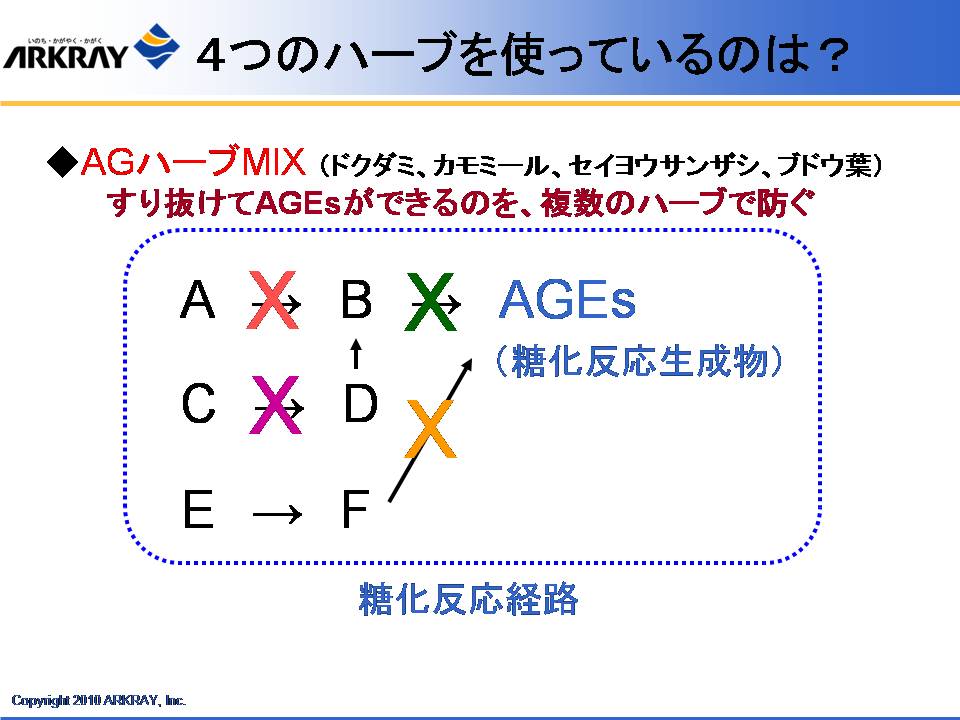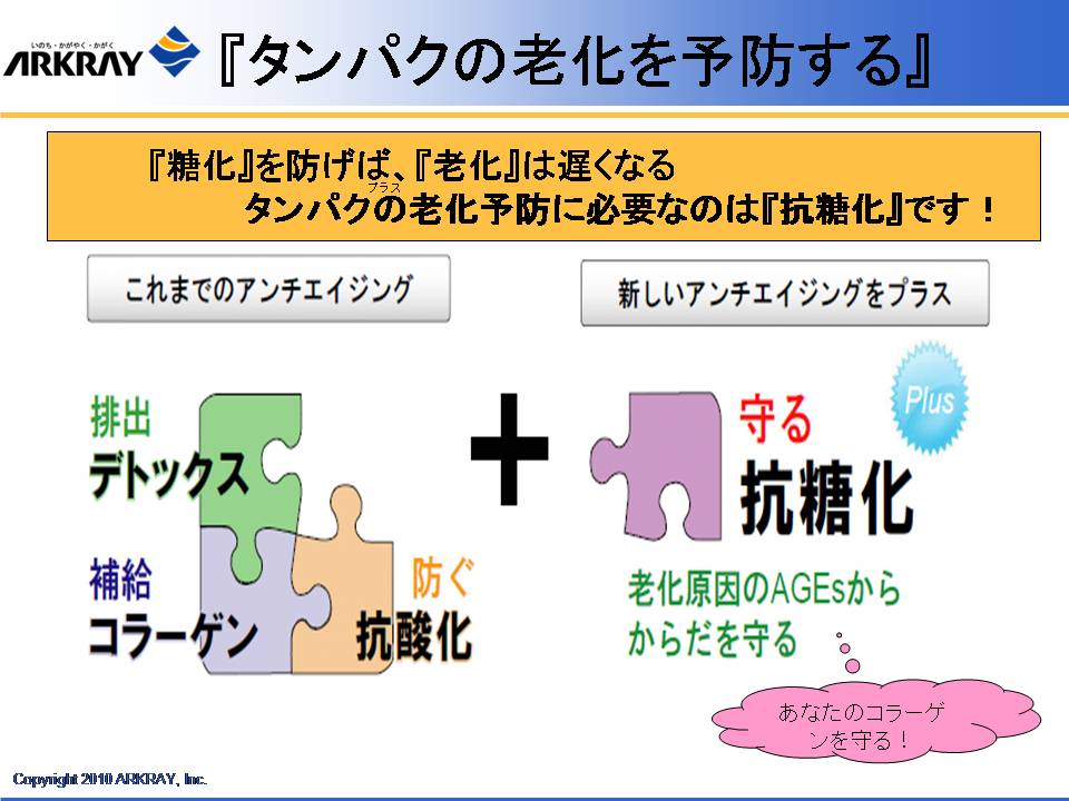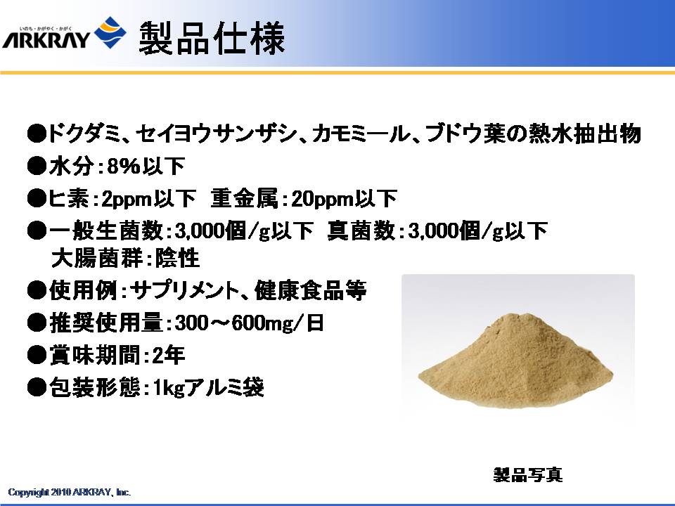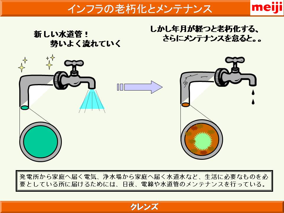 また、明治製菓の健康食品の概念として、体がさびる、こげる ことを防ぐ、ことが大きなテーマとしてあり、これは食べた栄養成分が効率よく吸収されるためにはまず腸がきれいであることが大事であり、吸収された成分の循環を良くするためには血管の状態、血液の状態を健康に保ち、酸化も防止する必要があることが示された。これを達成するための「クレンズ」という概念について解説された。体内インフラの整備を目的に、同社が研究した成果として、フルクトオリゴ糖、体内の糖化反応を抑制する植物成分として見出されたドクダミ、セイヨウサンザシ、カモミール、ブドウの葉の抽出物の有効性について解説された。