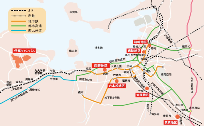 天神バスセンター下車→(地下鉄)→「箱崎九大前駅」で下車(10分)