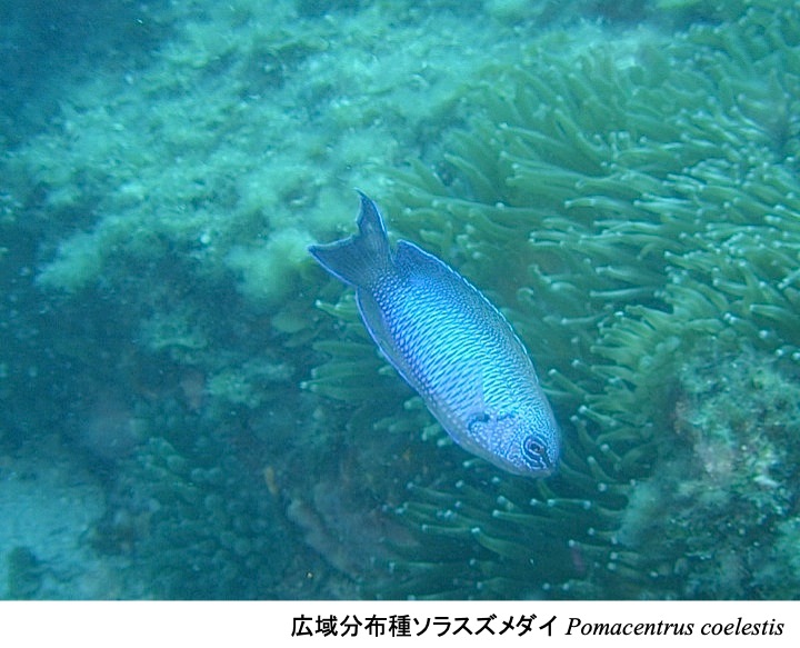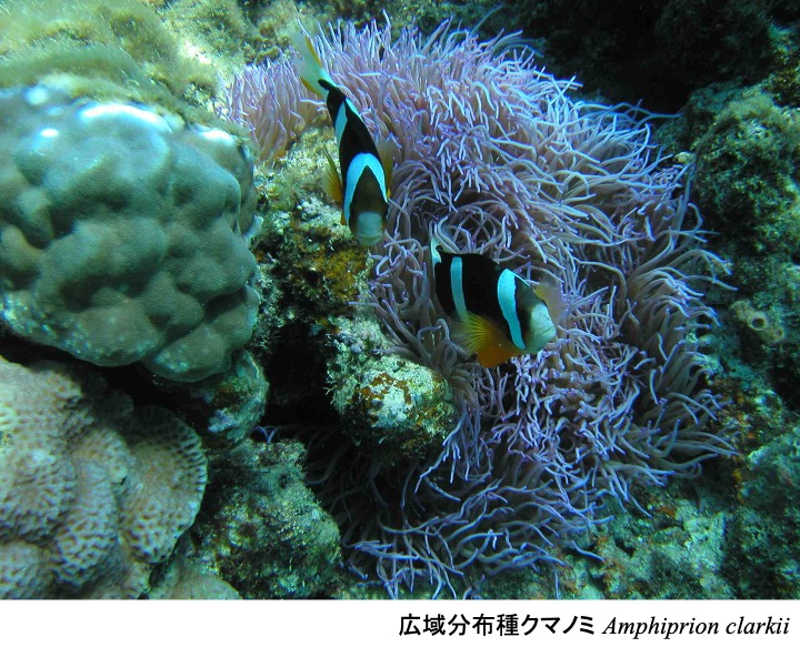 海洋環境では浮遊生活期に海流により広域に拡散する大きな潜在性が存在します。祖先集団から少数個体が新しい生息地へ移住した場合、移住後に強い遺伝子浮動を受けるとともに、移住地の異なった物理化学的・生物的環境条件による強い自然選択圧が作用すると考えられます。その結果、集団間の遺伝的交流が完全に制限されない状況下であっても、地域固有の適応形質をもつ遺伝的集団が形成されている場合がありえます。これは「遺伝子流動存在下での局所適応」と呼ばれる現象ですが、このような環境適応と関連した種内の遺伝子型の地理的遍在パターンの理解は、海洋生物の保全や水産育種素材としての利用において重要な示唆を与えます。熱帯域に起源を持ち、高緯度の温帯環境にも進出した超広域分布種は、この問いの良いモデル系であり、現在、クマノミ(clarkii種)とソラスズメダイの2つのモデル系と対象とした研究を進めています.