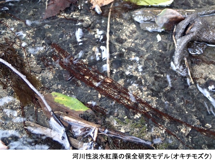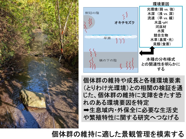 希少種であるオキチモズクの生育地は九州に多く、その分布は局所的かつ限定的です。近年は各地で個体群の縮小傾向、消失が起きていることから遺伝的多様性の低下が危惧されています。一方、保全に向けた取り組みとして生育環境を効果的に整備するには、本種の至適環境を整えてやる必要があります。本種は、「湧水がそそぐ、流れの緩やかな清澄な河川で、やや薄暗い光環境を好む」とされていますが、いかにも抽象的すぎて具体性に欠けています。本研究課題では、個体群の維持に適した景観管理の模索、及び遺伝的多様性の実態解明を追究します。具体的には、本種の生態を理解するうえで鍵となる生育地の光環境に対し、刻一刻と変化する光環境の実態を把握するため、新たに開発する低価格デジタルデバイスを用いた多地点同時解析を通して、生育の長期・積算的な指標(生育密度、藻体長)と瞬間的な指標(光合成、光阻害、水温)、各種物理環境との相関を検証することで、個体群の維持に支障をきたす恐れのある環境要因、および景観を特定することを目指します。九州大学伊都キャンパス内を流れる幸川をモデル河川として研究を行っています。さらに、マイクロサテライトを用いた遺伝的多様性解析により、本種の個体群間・内の遺伝的流動の有無、遺伝的多様性の程度を明らかにし、個体群の持続可能性を評価しようとしています。