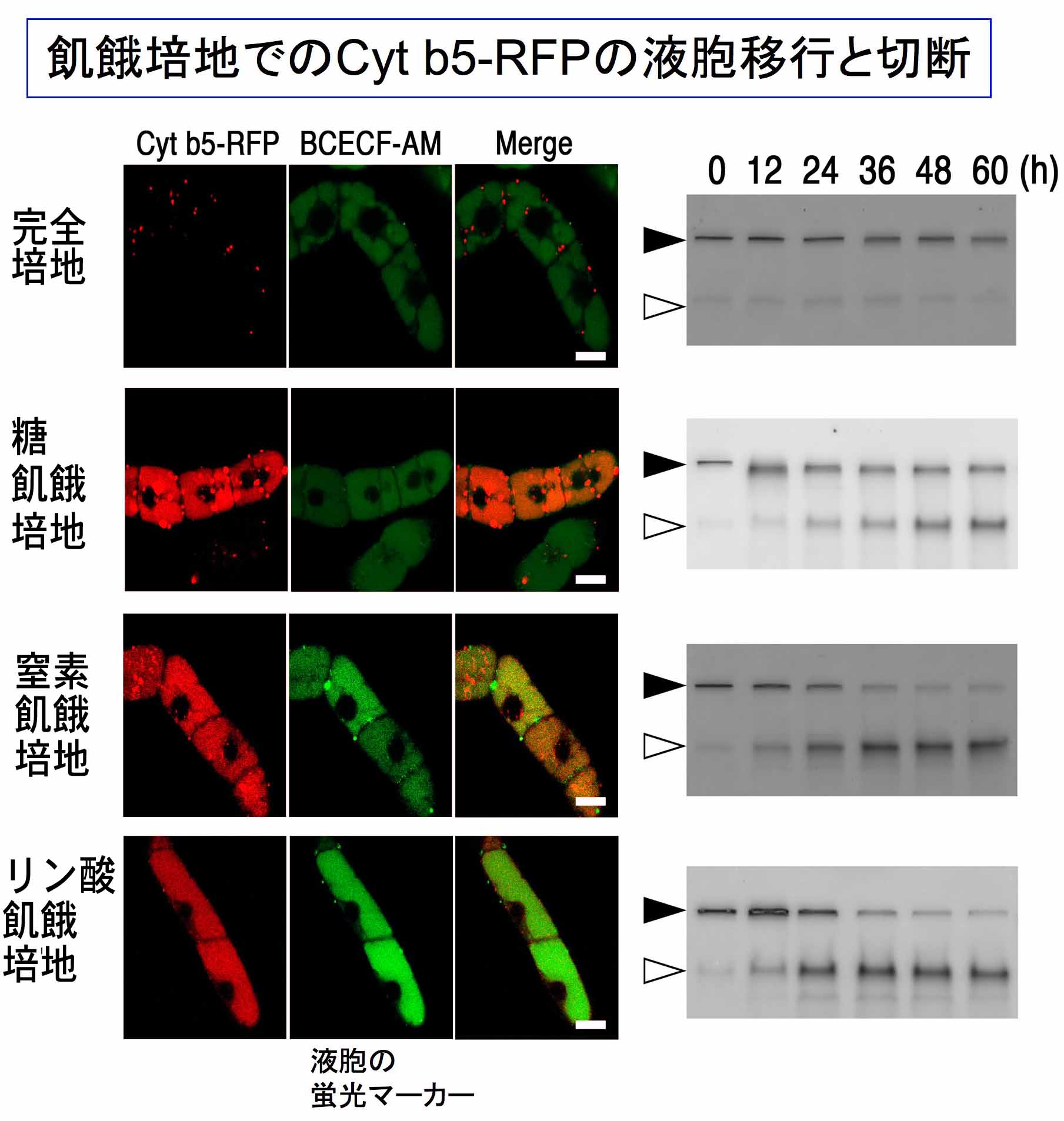 そこで、このような栄養不足に対応するため、植物を含む真核生物は、自食作用(オートファジー)と呼ばれる機構を発達させてきました。自食作用とは、細 胞質の構成要素の一部を、リソソームまたは液胞に運び分解することにより、外部からの栄養等の供給無しに、代謝活 動に必要なアミノ酸やエネルギー源の化合物を細胞内に供給する機構です。 この機構を可視化するため、私達は、赤色蛍光タンパク質由来の凝集体をレポーターとする実験系を開発しました。この系は、植物細胞においてはオートファ ジーによる分解が液胞で起ることと、液胞は細胞内で最も大きな体積を占めることを利用しています。富栄養状態では細胞質に点状に分布する赤色蛍光タンパク 質凝集体は、細胞を飢餓にさらすと減少し、赤色の蛍光は液胞に移ってゆきます(下図)。その際に、レポーターとし て用いているCytb5−RFPの切断が認められます。 現在、この実験系を用いて、糖、窒素、リン酸の各々が不足した際の、オートファジーの誘導機構に違いがあるか、研究を進めています。 ![]() |