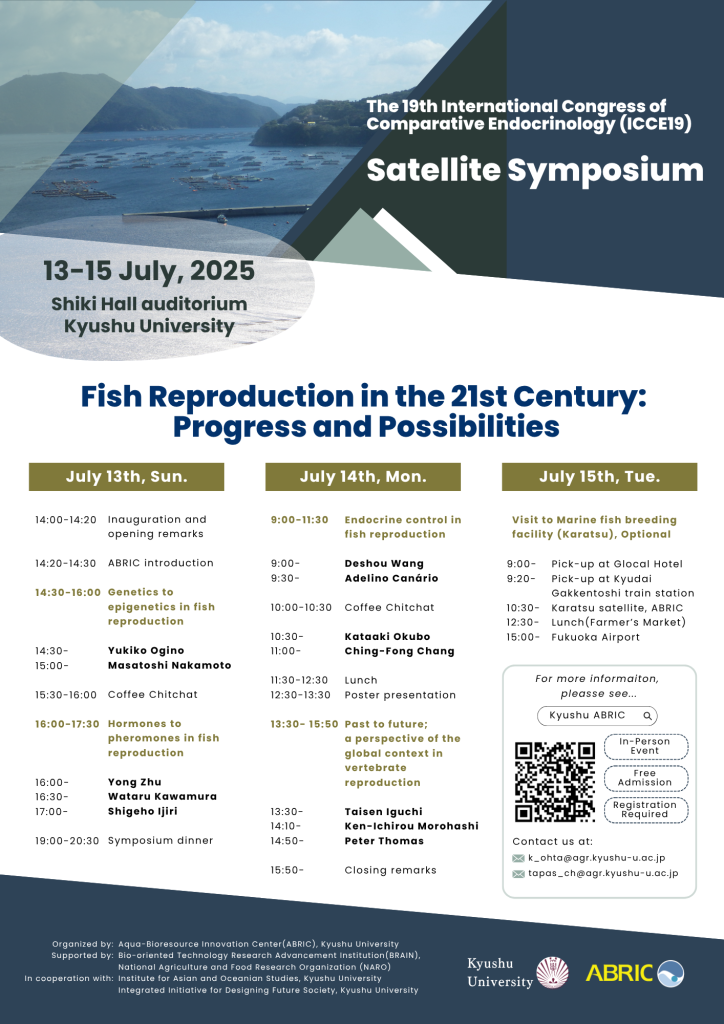 This two-day event, held as a satellite symposium of the 19th International Congress of Comparative Endocrinology (ICCE19), focuses on bringing together specialists in fish reproductive biology and related disciplines. The Department of Bioresource and Bioenvironmental Sciences at Kyushu University is pleased to welcome researchers, academics, industry professionals and graduate students to this unique platform, which is dedicated to advancing our understanding of fish reproduction within contemporary scientific contexts.