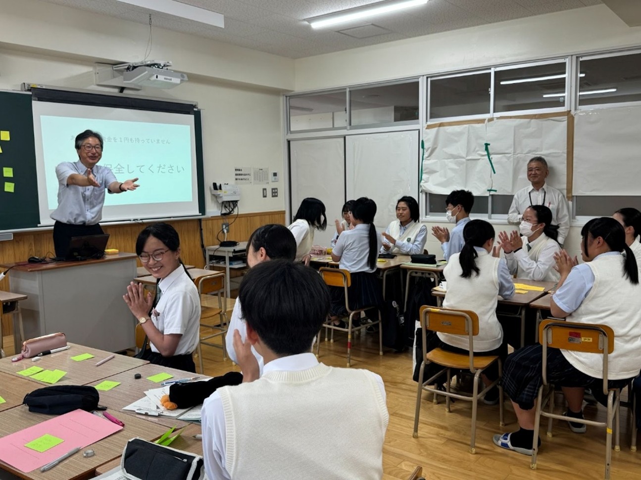 最初は「昆虫とウナギがどこで繋がっているの?」と、高校生からは不思議そうな顔をしながら始まった講義でしたが、水域と陸域のつながりや魚と昆虫との相互作用について学んだ後、付箋を使ったブレインストーミングで具体的なウナギの保全策について様々な案を挙げてもらい、繋がりについての学びを深めました。