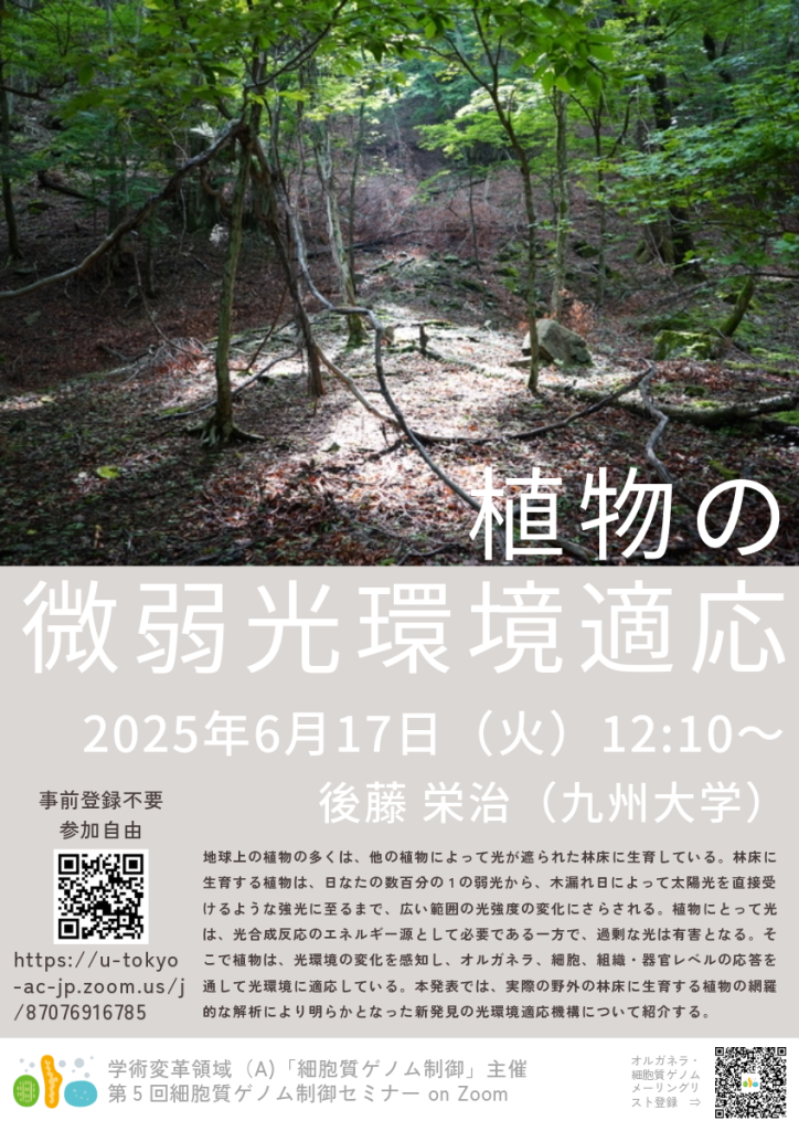 概要:地球上の植物の多くは、他の植物によって光が遮られた林床に生育している。林床に生育する植物は、日なたの数百分の1の弱光から、木漏れ日によって太陽光を直接受けるような強光に至るまで、広い範囲の光強度の変化にさらされる。植物にとって光は、光合成反応のエネルギー源として必要である一方で、過剰な光は有害となる。そこで植物は、光環境の変化を感知し、オルガネラ、細胞、組織・器官レベルの応答を通して光環境に適応している。本発表では、実際の野外の林床に生育する植物の網羅的な解析により明らかとなった新発見の光環境適応機構について紹介する。