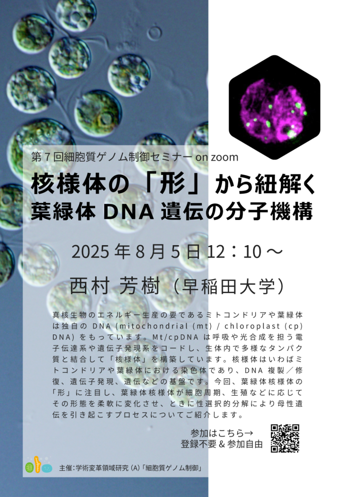 概要:真核生物のエネルギー生産の要であるミトコンドリアや葉緑体は独自のDNA (mitochondrial (mt) / chloroplast (cp) DNA) をもっています。Mt/cpDNAは呼吸や光合成を担う電子伝達系や遺伝子発現系をコードし、生体内で多様なタンパク質と結合して「核様体」を構築しています。核様体はいわばミトコンドリアや葉緑体における染色体であり、DNA複製/修復、遺伝子発現、遺伝などの基盤です。今回、葉緑体核様体の「形」に注目し、葉緑体核様体が細胞周期、生殖などに応じてその形態を柔軟に変化させ、ときに性選択的分解により母性遺伝を引き起こすプロセスについてご紹介します。