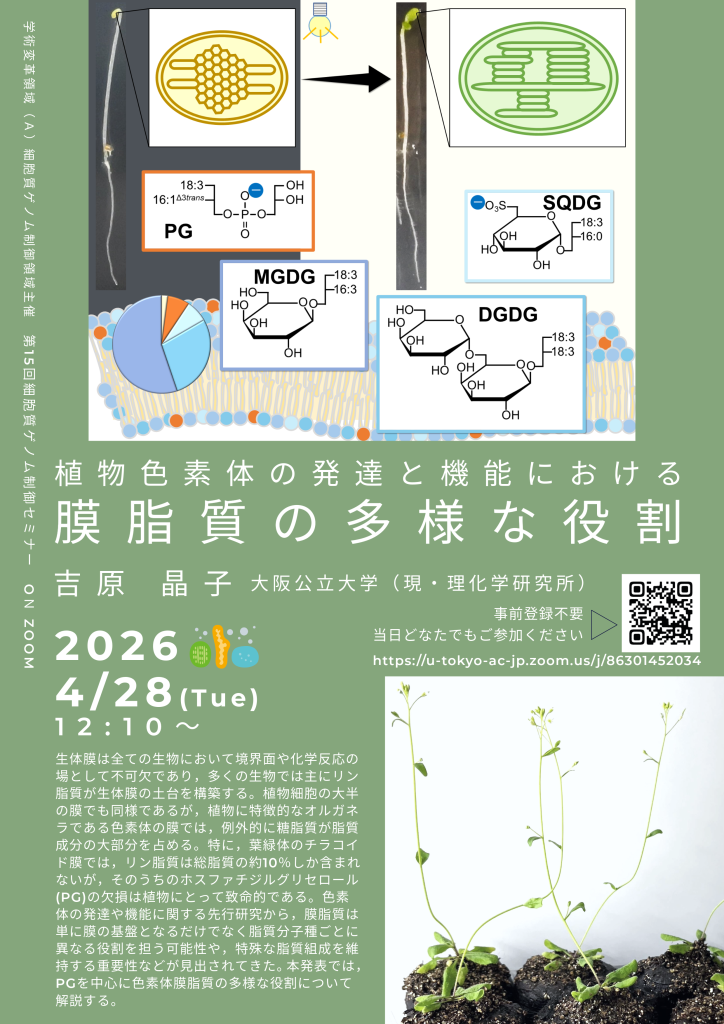 概要:生体膜は全ての生物において境界面や化学反応の場として不可欠であり,多くの生物では主にリン脂質が生体膜の土台を構築する。植物細胞の大半の膜でも同様であるが,植物に特徴的なオルガネラである色素体の膜では,例外的に糖脂質が脂質成分の大部分を占める。特に,葉緑体のチラコイド膜では,リン脂質は総脂質の約10%しか含まれないが,そのうちの ホスファチジルグリセロール (PG)の欠損は植物にとって致命的である。色素体の発達や機能に関する先行研究から,膜脂質は単に膜の基盤となるだけでなく脂質分子種ごとに異なる役割を担う可能性や,特殊な脂質組成を維持する重要性などが見出されてきた。本発表では,PGを中心に色素体膜脂質の多様な役割について解説する。