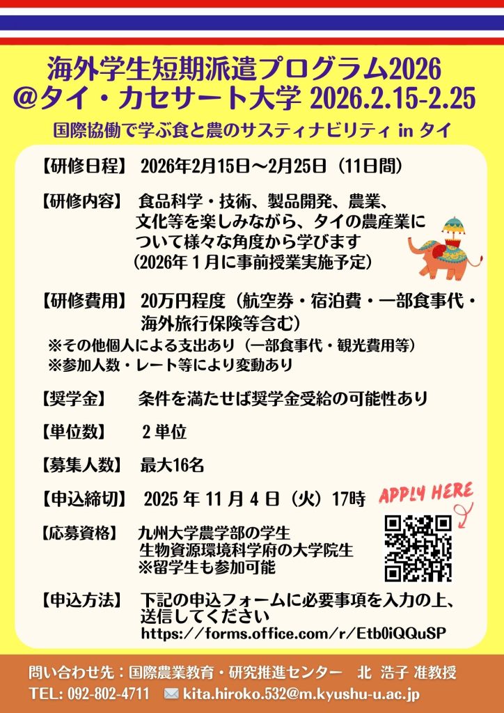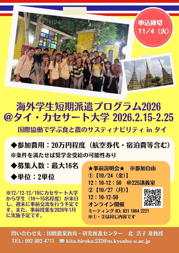 ※なお、12/12~12/19にカセサート大学から学生(10~15名程度)が来日し、週末に事前交流を行う予定です。また、事前授業を2026年1月に実施予定です。