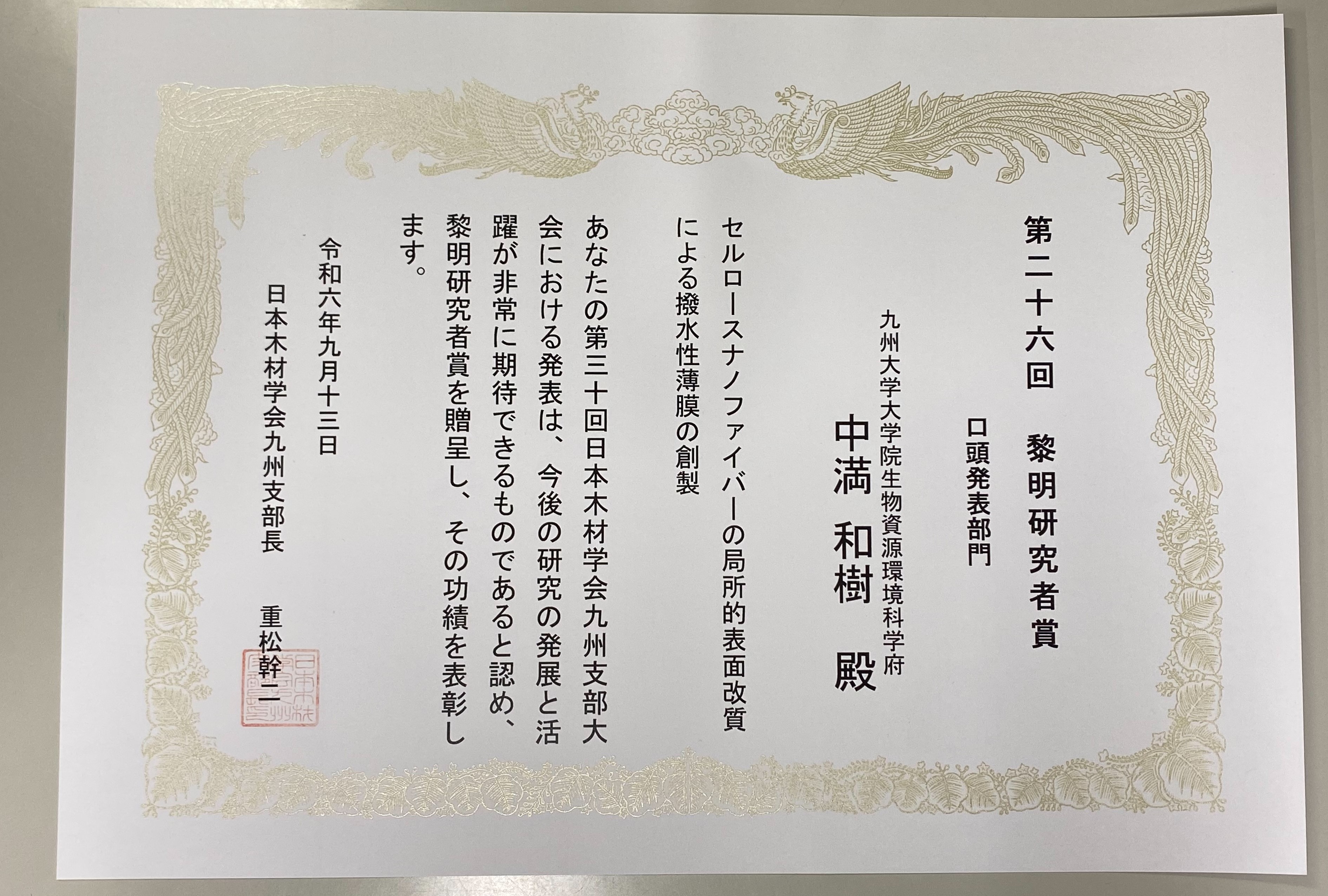 修士1年の中満和樹君が黎明研究者賞を受賞しました!!!