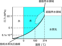 超・亜臨界水超臨界水は高温と高圧条件下の水の事で、水なのに有機溶媒(アルコールやアセトン)と同じ性質になってしまい、有機溶媒にしか溶けないような物質がすべて溶けるようになります。またイオン積(水がH+とOH-に電離している量、10-14 mol/L)が通常の水より3ケタも多くなり、加水分解反応が混でるだけで起こるようになり、この水を応用した研究を試みています。 |