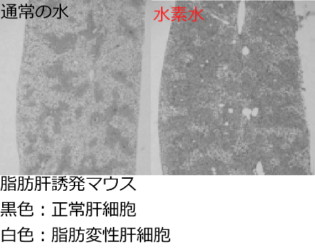 溶存水素水電解水にも含まれる水素には最近生体酸化ストレス軽減効果を示すことが明らかとなっていますがその理由がわかっていません。例えば、水素を含んだ水を脂肪肝誘発マウスに食べさせると普通の水を飲ませたマウスと比較して明らかに脂肪肝の少ないマウスができます。私たちは水素が新たな生体ガスメディエーターとして機能する事を証明しようとしています。 |