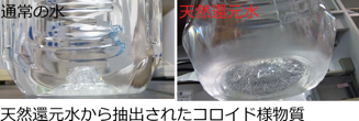 天然還元水ある特殊な場所で採取される天然水に機能水様の効果を示す天然還元水が存在することを明らかになっています。そしてこの天然還元水が持つ効果について科学的エビデンスを持って研究に取り組んでいます。先に書いた水の超臨界状態を人工的に作り出すのは大変ですが、熱水噴出孔の下や地殻深部では簡単に条件がそろいます。そのためそのような環境下の水では通常考えられない化合物が溶け込み特殊な形状になると推測されます。私たちは天然還元水がこのような機序で作られているのではないかと考えその証明を試みています。 |