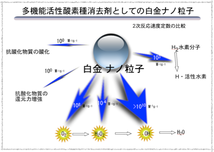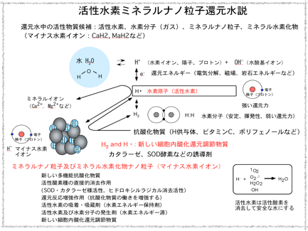 当研究室では1996 年にガン、糖尿病、動脈硬化症、神経変性疾患、アレルギー症など酸化ストレス関連疾患の患者が電解還元水を日常的に飲用することにより症状が改善されたという一部の病院からの報告に注目した。多くの疾病に共通する原因あるいは増悪因子が活性酸素であること及び電解還元水は分子状水素を多量に含むことに注目し、電解還元水中の不活性な分子状水素が何らかに機構により活性化されて生成する活性水素により体内の過剰な活性酸素が消去されるために、様々な酸化ストレス関連疾患が改善されるという「活性水素還元水説」を提唱した。その後、電解還元水が電極由来の白金ナノ粒子を含有することが明らかとなり、白金ナノ粒子の触媒作用により水素分子から活性水素が発生するだけでなく、白金ナノ粒子自体が活性酸素種を直接的に消去する作用をもつという「活性水素ミネラルナノ粒子還元水説」を提唱した。