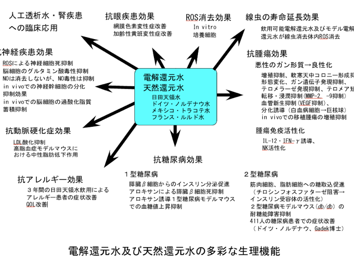 水道水由来の電解還元水は様々な無機及び有機化合物を含むことから電解還元水モデル水としてNaOH 水由来電解還元水を用いて、インビトロでの還元力及び抗酸化力、動物培養細胞や実験動物レベルでの抗腫瘍効果、抗糖尿病効果、抗動脈硬化症効果、抗神経変性疾患効果などを明らかにしてきた。また、天然水の中にも、大分県日田市の地下水(商標日田天領水)、ドイツのノルデナウ水、フランスのルルド水なども還元力を持ち細胞内の活性酸素を消去する天然還元水であり、抗糖尿病効果を持つことを明らかにした。日田市天然還元水については実際に中国吉林省長春市の市民病院や福岡市の福岡徳洲会病院で臨床試験がなされ、ヒトで抗糖尿病効果を持つことが実証されている。また、ドイツ・ノルデナウ水については医師Z. Gadek 博士との共同研究を行い、411 人の2 型糖尿病患者を対照にした臨床試験で症状が改善されることを報告した。広島大学大学院医歯薬総合研究科で2008年11月~2009年9月に実施された100名のボランティアを対象にした抗メタボ効果無作為二重盲検臨床試験でも、日田市天然還元水を一日約2リットル飲用することにより、血圧の低下、便秘の改善、総コレステロール値の低下、LDLコレステロールの低下、アディポネクチン(善玉サイトカインの一つ)の増加、GOT・GPT・γ-GTPの低下、空腹時血糖値の低下、中性脂肪の低下、動脈硬化指数の低下、レプチン(善玉サイトカインの一つ)の増加、尿酸値の低下、尿中8-OHdG(遺伝子の酸化ストレスマーカー)の低下などの有意な効果が認められた。