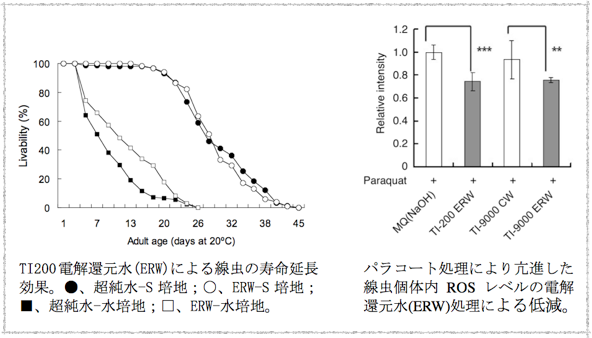 一方、2007 年に分子状水素がヒドロキシルラジカルなどの活性酸素を直接消去し、脳梗塞モデルラットの症状を改善するという論文が報告されて以来、水素分子の酸化ストレス関連疾患モデル動物における改善効果に関する論文が多く発表されている。我々は任意の混合ガス雰囲気下で細胞培養できるガスインキュベーターを開発し、水素分子の培養細胞に及ぼす効果を詳細に検討した。その結果、分子状水素が細胞内の抗酸化酵素群を誘導するレドックス制御機能を有し、間接的に細胞内活性酸素を消去するという機構を明らかにした。また、線虫の寿命に及ぼす電解還元水の効果を明らかにするために、新しい水培養法を開発し、水道水由来の飲用可能なTI-9000 電解還元水及びNaOH 水由来のTI-200 モデル電解還元水がともに線虫体内の活性酸素を消去し、線虫の寿命を延長させることを明らかにした。
