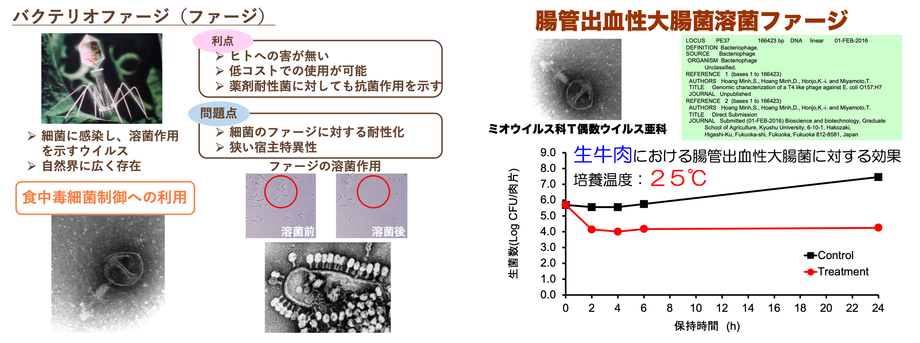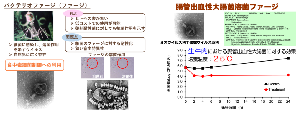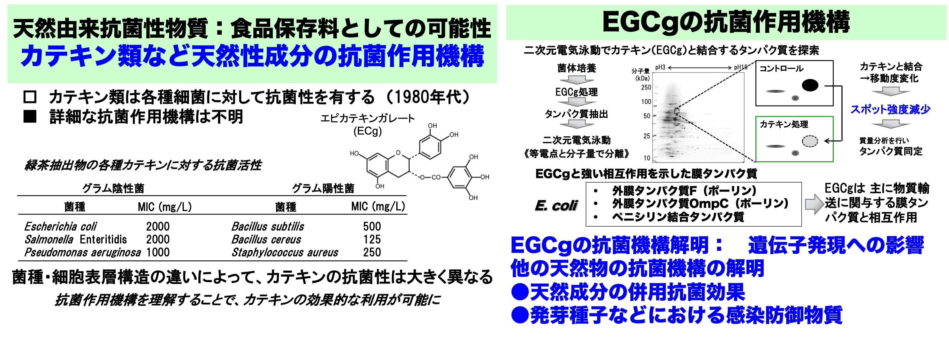 食中毒細菌や腐敗細菌の制御を目的として、ポリフェノールなどの抗菌活性や毒素阻害に関する研究、バクテリオファージを利用した制御法の確立といった研究をおこなっている。