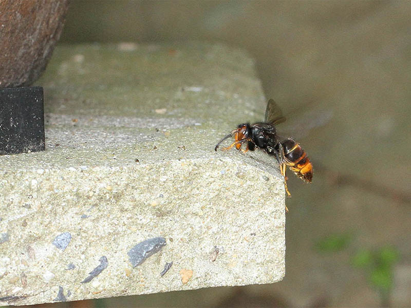 ツマアカスズメバチの働き蜂もとても俊敏なのですが、蜂洞前に飛来するとホバリングするなど、とても緩やかに飛んでいて、発見することも簡単です。また人の接近にもかなり無頓着なため、数十センチの距離でじっくり観察することもできます。近づいてたたき落とすことも容易です。実際、蜂洞を管理している人の多くが、蜂洞前に飛来したツマアカスズメバチの働き蜂をそうやってたくさん駆除しています。
