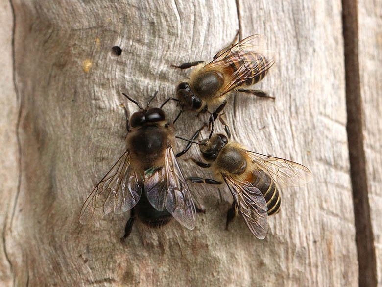 2匹の働き蜂と1匹の雄バチ。蜂洞前で活発に活動する。