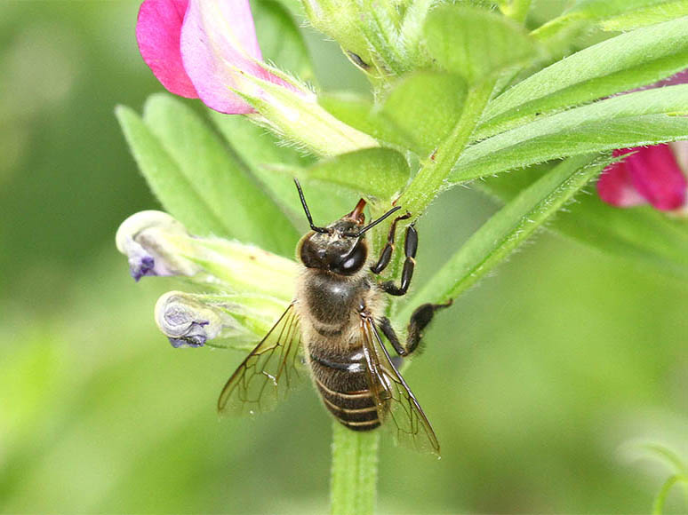この時期は様々な種類の花が咲くので、蜂たちも蜜や花粉を集めに訪花するのですが、花だけでなくカラスノエンドウの花外蜜腺などにも惹かれてやってきます。花外蜜腺からは甘い蜜が出るので、それを好んで舐めます。今回はカラスノエンドウに飛来する蜂類を多数見かけました。