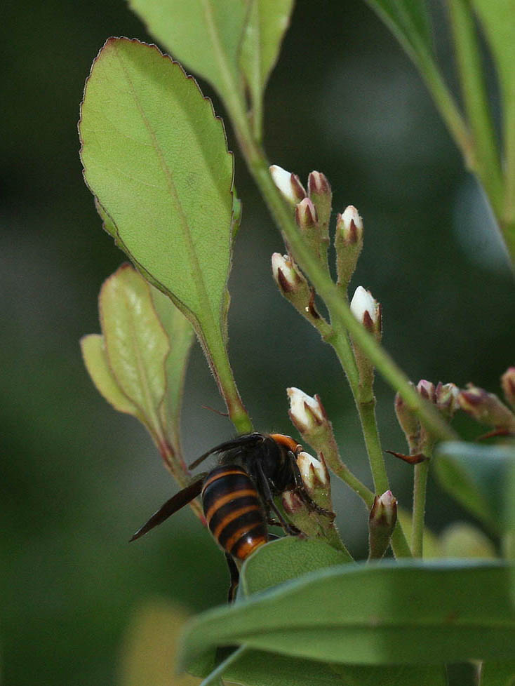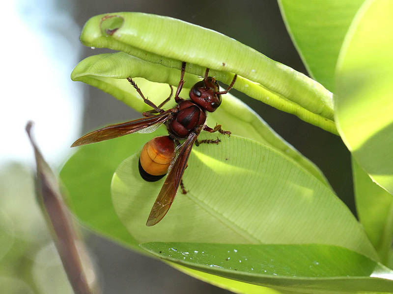 キジラミ(セミやウンカの仲間)の甘露に引かれて飛来。テリハボクの木にはツマグロスズメバチがよく来集する。