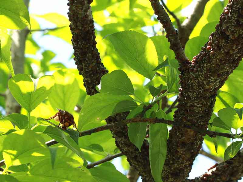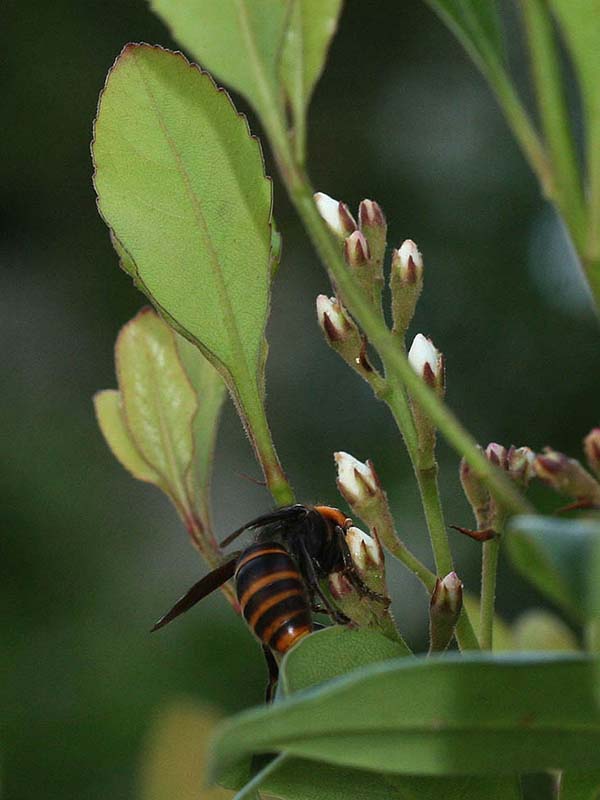 アリのようにアブラムシを守るようなことは決してありませんが、甘露が欲しくて甘い匂いに誘引され、様々な昆虫が集まってきます。その代表的な昆虫にハチの仲間が含まれていて、各種の寄生バチ、カリバチ、アシナガバチ、スズメバチたちが甘露を舐めに庭木にやってくるのです。