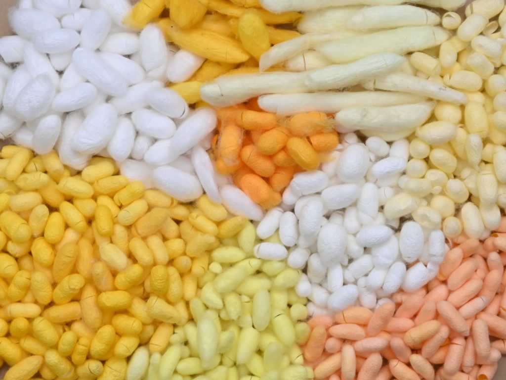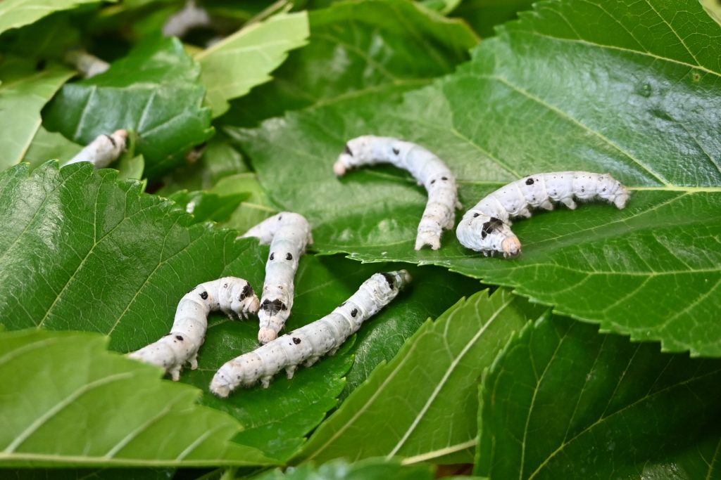 普通、カイコの繭は白色が一般的ですが、実は黄色、オレンジ、ピンク、クリーム色など様々です。幼虫の形質も黒や茶色、赤などの体色になるものや斑紋の数が多いもの、皮膚が透けているものなど、ユニークな特徴を持つ多様なカイコがいます。