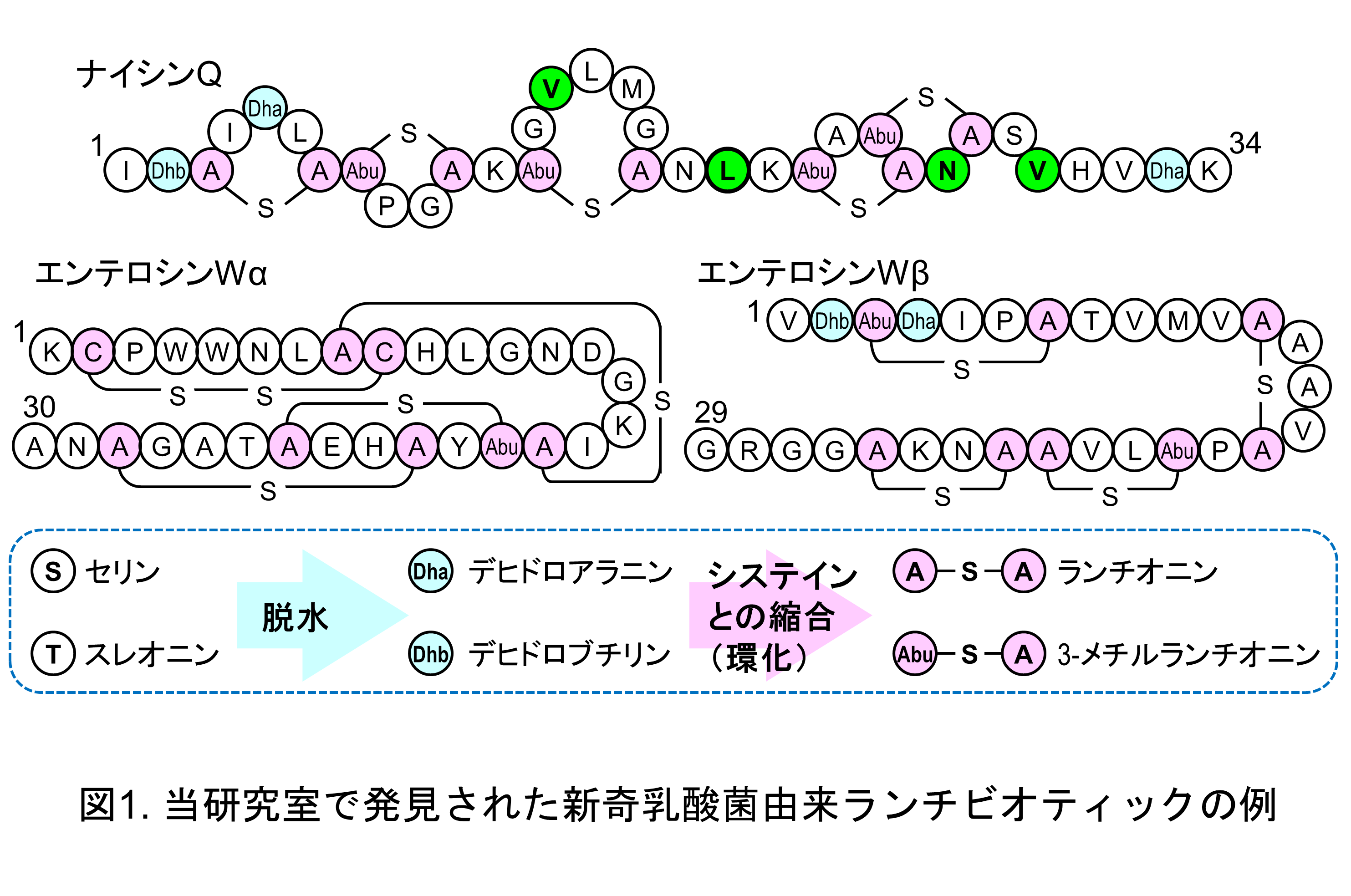河川水から分離した乳酸菌Lactococcus lactis 61-14からナイシンA・Zに続く第三のナイシン類縁体としてナイシンQを発見した(図1)。ナイシンAとは同様の架橋パターンを保持しながらも4つのアミノ酸残基が異なり、ナイシンA・Zと同様の生合成遺伝子群によって生合成されることが明らかとなっている。また、発酵魚から分離した乳酸菌Enterococcus faecalis NKR-4-1からは新奇二成分ランチビオティックであるエンテロシンWを発見し(図1)、2つのペプチド(WαとWβ)が相乗的に抗菌活性を示すことを明らかにした。