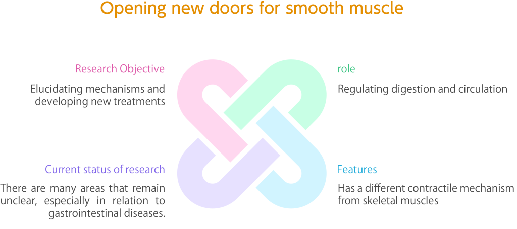 When comparing skeletal and smooth muscle at the cellular level, many proteins are similar. Smooth muscle has inherently greater potential value as a meat source, as proteins release flavorful amino acids when broken down. Biologically, smooth muscle has a vital role not only in the digestive tract, but also in blood vessels, uterus, lungs, etc. At first glance, the gastrointestinal tract is a single tube that physically joins together, but it is a complex group of organs composed of multiple organs from the esophagus to the rectum. The smooth muscle layer is responsible for contraction and peristalsis, which is the common and most important function of all gastrointestinal organs. Smooth muscle cells, which are arranged in an annulus covering the secretory cell layer of the lumen of the digestive tract, contract in a coordinated and sustained manner to ensure smooth digestion, absorption, and expulsion of unwanted substances. No one, from infants to adults, has ever experienced gastrointestinal problems such as lethargy, constipation, diarrhea, stress ulcers, and cancer due to poor food digestion and absorption. Despite their important role, it is still unclear how smooth muscle cells develop and are maintained until the end of life. In the Animal Life Science Laboratory, we are using the chick embryo myogastrium as a model to elucidate the mechanism of smooth muscle cell development and differentiation.