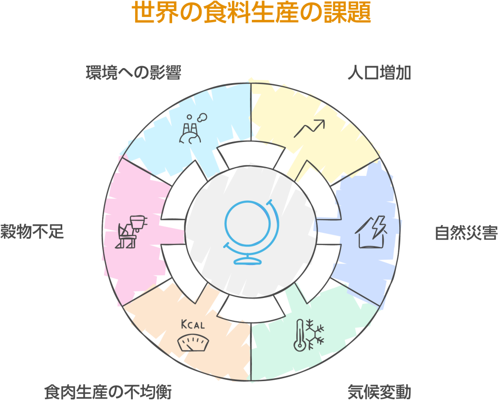 近年、世界的な人口増加や自然災害、地球温暖化により食料の安定供給と確保が課題となっています。肉類も例外ではなく、欧米では地域生産量が消費量を上回っているのに対し、人口増加の著しい途上国、特にアジアでは生産量が足りず将来さらに深刻な問題となることが予測されています。家畜数の増加は世界の穀物飼料の調達合戦、家畜排せつ物による環境負荷に直結しており持続的な食肉生産を考える必要があります。