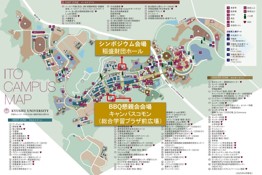<BBQ懇親会に関しまして>キャンパス移転とコロナ禍のため休止していた,箱崎キャンパス時代に毎春開催していた熱研主催のBBQを復活開催いたします! 開催場所:キャンパスコモン(総合学習プラザ前広場,以下の地図参照) 開催時間:17:00-19:00 参加費:教職員・その他:1500円 学生:500円 箱崎時代と違って様々な制約もあり,およそ2時間の短い時間の会になりますが予想されますが,奮ってご参加いただければ幸いです!